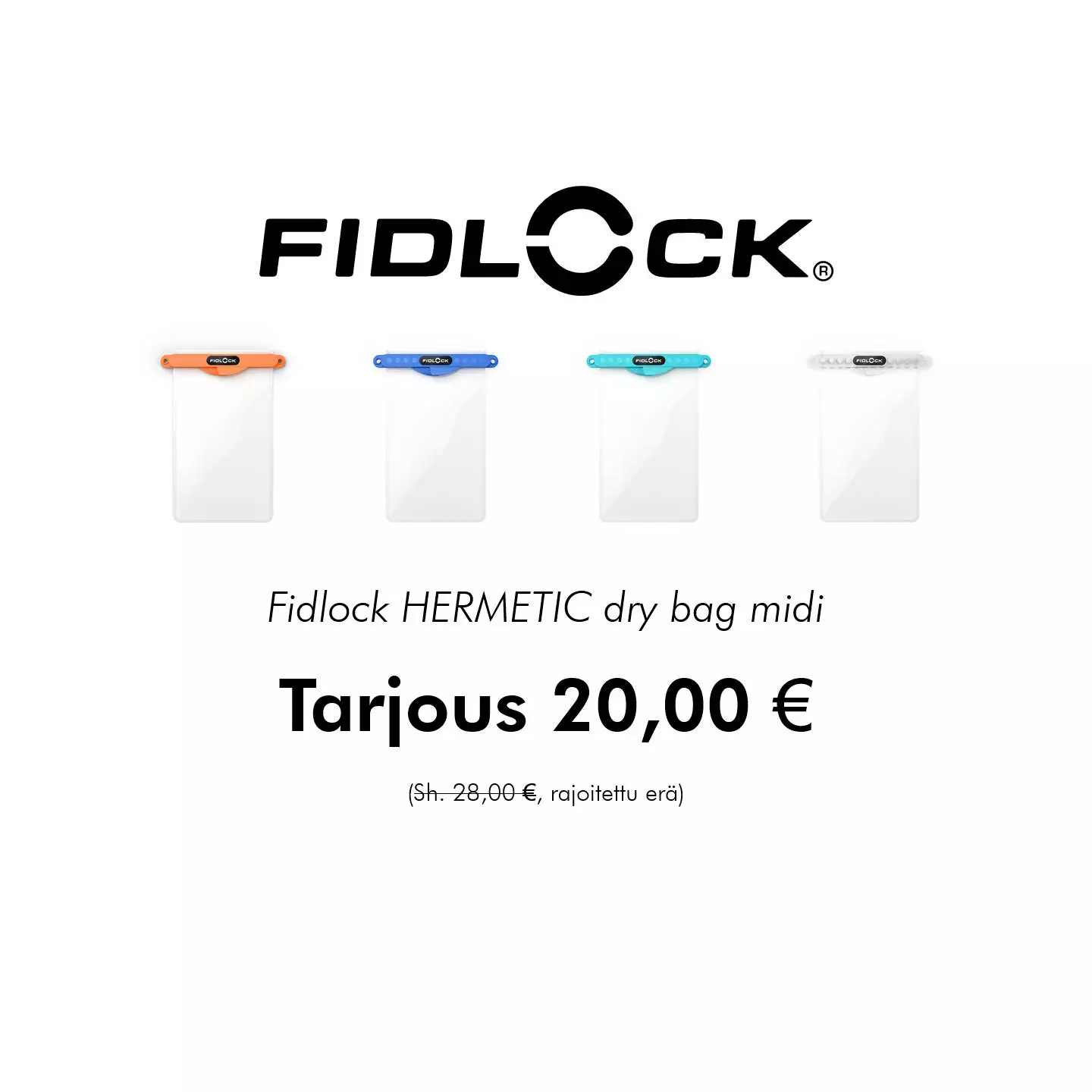 Nyt erikoiserä tarjoushintaan 20,00€! Fidlock Hermetic Dry Bag Medi -puhelinpussi on IP-X8-luokiteltu suojapussi nykyaikaisille älypuhelimille. 100% vesi- ja pölytiivis Fidlock suojaa puhelintasi... Lue lisää